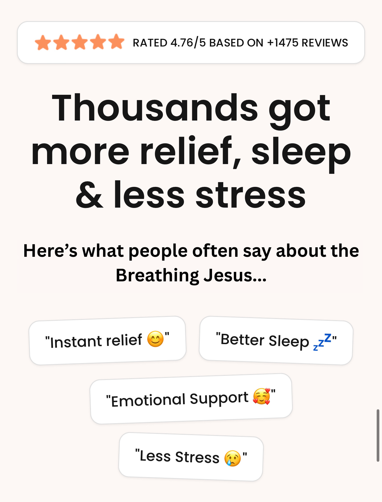 Unwind and relax with the My Little Breathing Jesus' soothing breathing rhythm, designed to match your natural frequency and promote relaxation.